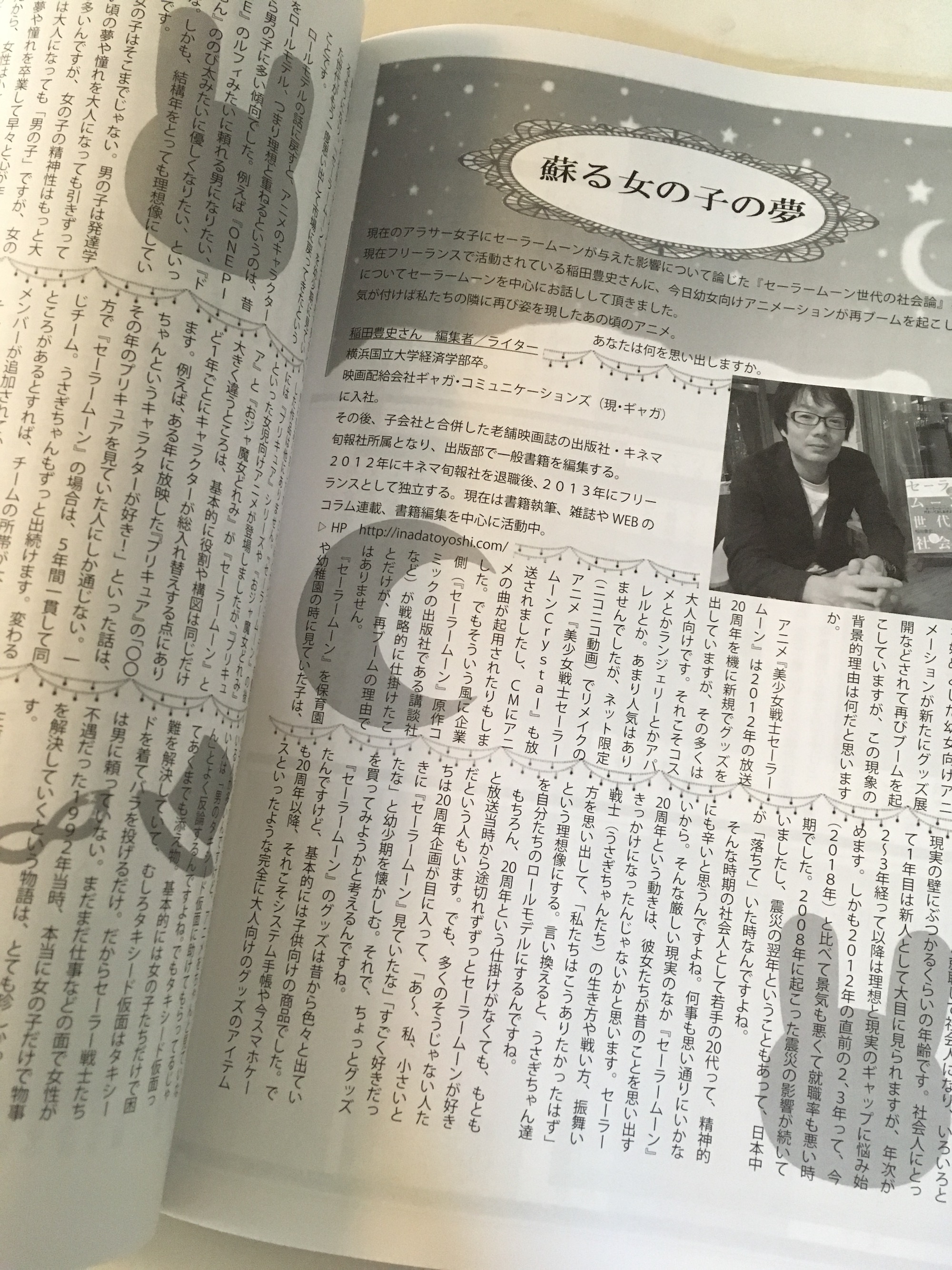 専修大学 文学部 日本文学文化学科の学生さんがゼミ活動の一貫として作っている雑誌「SHOW」で、インタビューされました。「蘇る女の子の夢」と題し、なぜ『セーラームーン』がいまだに成人女性にも人気があるのかという点について、時代背景や世代論とあわせて見解を述べさせていただいた次第。なんか6ページも文字ぎっしりで…恐縮です。