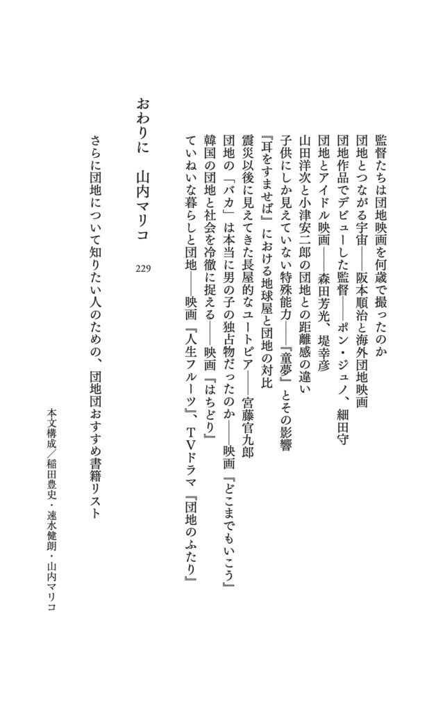 所属している団地団としての共著『世界は団地でできている 映画のなかの集合住宅70年史』が刊行されました! 団地が登場する作品をとおして世相や風俗、家族やジェンダー、創作論や作品論を縦横無尽に語る、団地団6人組の楽しき〈よもやま話〉が1冊に! 6人がしゃべっていることの文章化に加え、日本橋高島屋の企画展「団地と映画」の展示内容も一部収録しています。稲田は団員の速水健朗さん、山内マリコさんとともに本文の構成を担当しました。