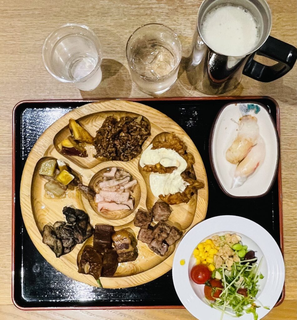 夕食のホテルバイキングがセルフサービスで酒飲み放題という最高の極悪仕様。大学芋で芋焼酎を飲む🥃