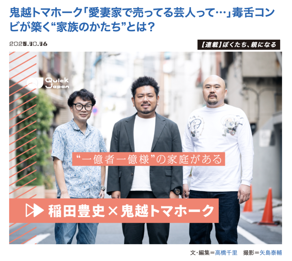 『ぼくたち、親になる』と絡め、QJ WEBで鬼越トマホークのふたりに、普段あまり話されることのない、ものすごーーーく対照的な金ちゃんと良ちゃんの【家族観】を語ってもらいました!