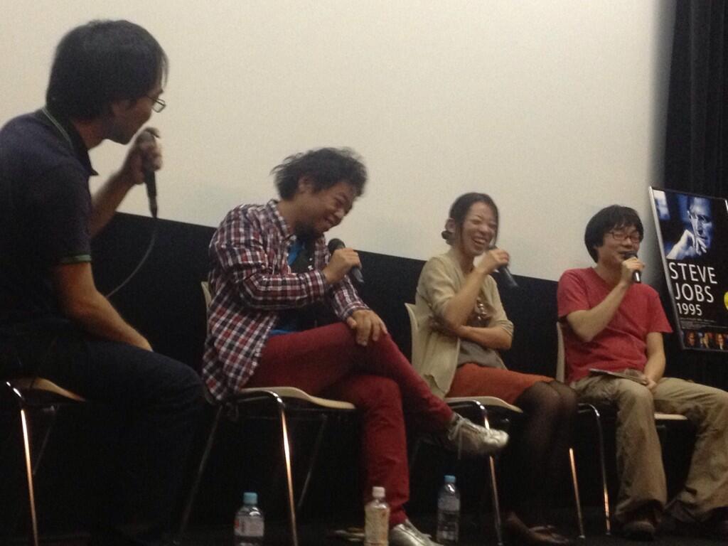 9月28日、『スティーブ・ジョブズ1995 〜失われたインタビュー〜』初日トークイベント、1時間じゃ全然足りませんでした(笑)。写真左から佐藤大さん(顔見えない…)、うめ・小沢さん、うめ・妹尾さん、稲田。懐かしのMac、ジョブズあれこれ、95年の話などを中心に、ノンストップ脱線上等の内容。その後打ち上げしたんですが、こちらも話題がヤバおもしろすぎて、もう大変。