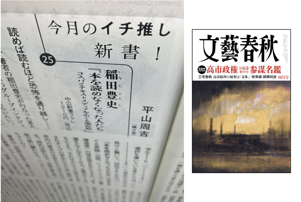 「文藝春秋」2026年4月号、平山周吉さんの「今月のイチ推し新書!」で『本を読めなくなった人たち』をご紹介いただきました。>読めば読むほど、恐怖を通り越し、無力感に襲われる。ニッポン、どうなっちゃうの?ありがとうございました!