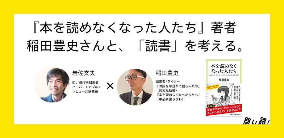 岩佐文夫さんとのオンラインイベント「『本を読めなくなった人たち』著者、稲田豊史さんと「読書」を考える。」、1時間の予定を大幅に超過し、大変盛り上がりました!他にも情報取得手段が存在するのに「読書」をする理由について、それなりに突き詰められたと思います。とても有意義な対話でした。